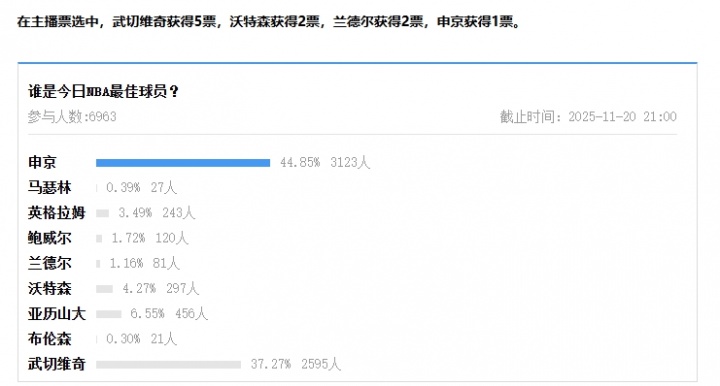 評選規(guī)則:候選球員由每場主播提名,吧友投票占比70%,主播投票占比30%,綜合占比最高者當(dāng)選今日最佳。
